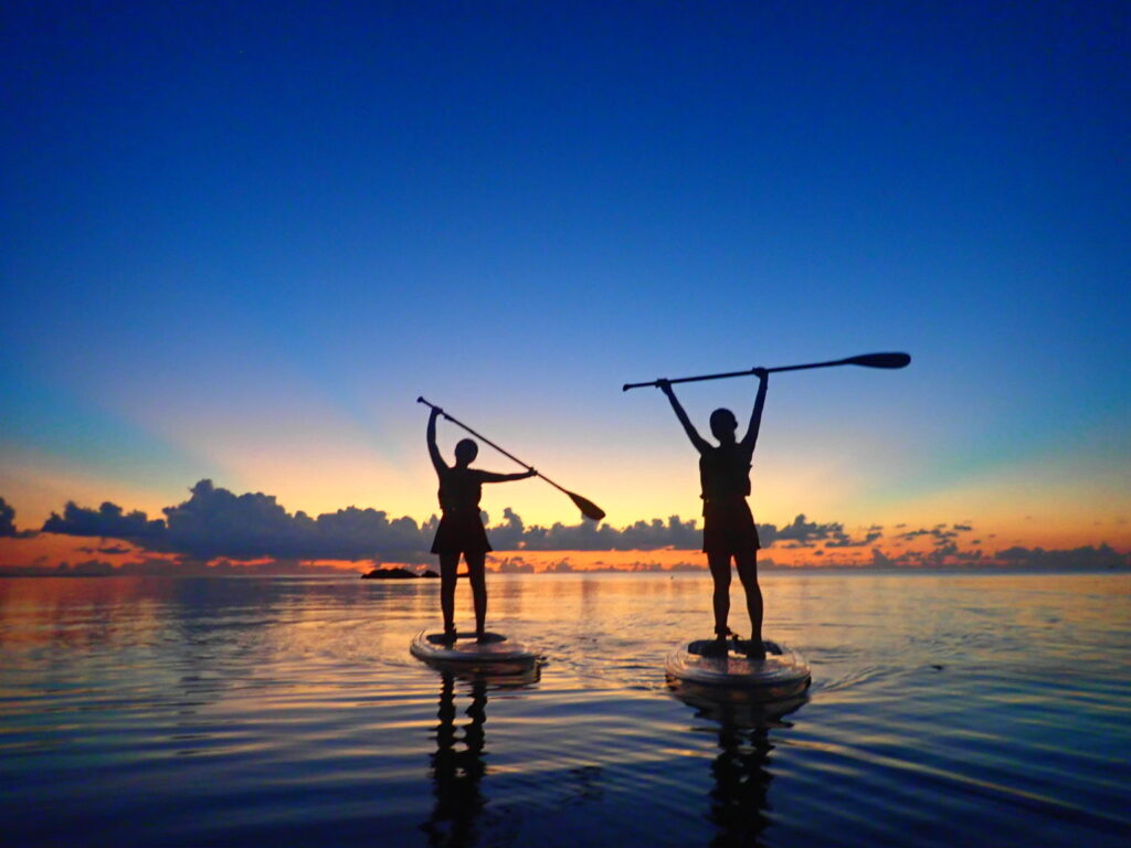 サンセットや朝日の時間帯に行われるSUPやカヤック体験は、少人数制で特に人気。